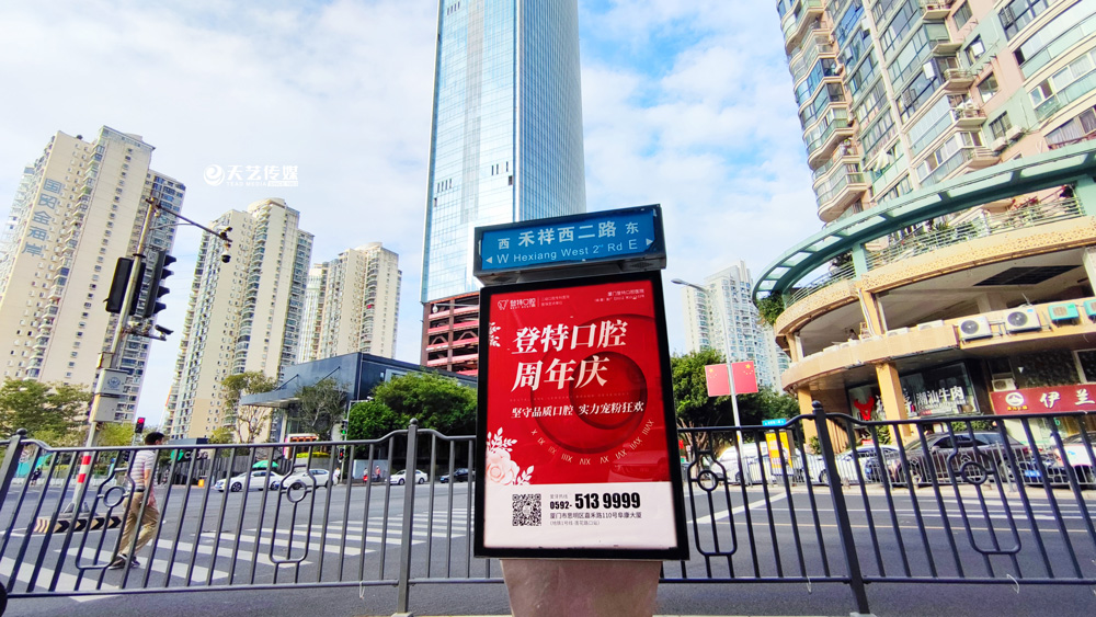 同時,廈門登特口腔繼續(xù)與廈門天藝傳媒合作,投放鷺島全城超200座城市路名牌,覆蓋島內(nèi)各大交通主干道(如嘉禾路、禾祥西路、禾祥東路)、核心商圈、商務(wù)區(qū)寫字樓林立區(qū)、人流車流覆蓋密集區(qū)域。